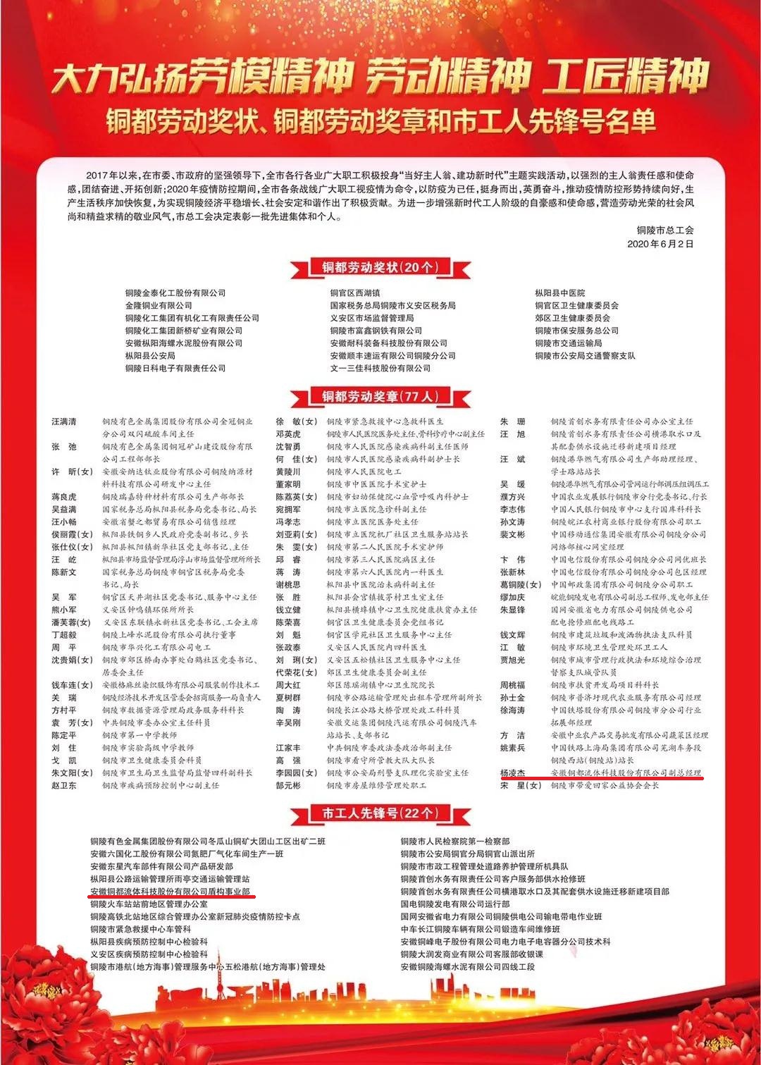 6月2日,銅陵市總工會(huì)發(fā)布名單,表彰了一批被授予“銅都勞動(dòng)獎(jiǎng)狀”、“銅都勞動(dòng)獎(jiǎng)?wù)隆焙汀肮と讼蠕h號(hào)”榮譽(yù)稱號(hào)的單位及個(gè)人。