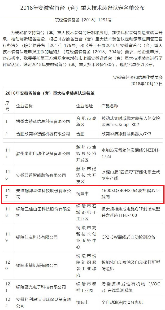由銅都流體自行研發(fā)的超大口徑、超高壓力DN1600 PN64液控偏心半球閥,經(jīng)銅陵市初審,第三方專家評審認(rèn)定,確定為2018年安徽省首臺(套)重大技術(shù)裝備。