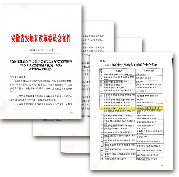 近日,安徽省發(fā)改委發(fā)布了“關(guān)于公布2021年度工程研究中心(工程實(shí)驗(yàn)室)批復(fù)、驗(yàn)收及評價(jià)結(jié)果的通知”,銅都流體成功獲批組建2021年度“安徽省中低壓閥門工程研究中心”。