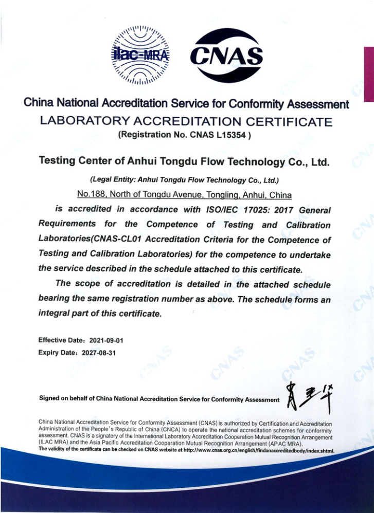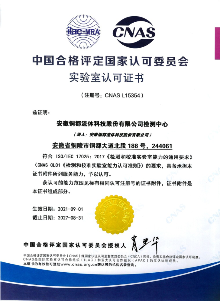 安徽銅都流體科技股份有限公司于近日獲得“中國合格評定國家認(rèn)可委員會(CNAS)實驗室認(rèn)可證書”。