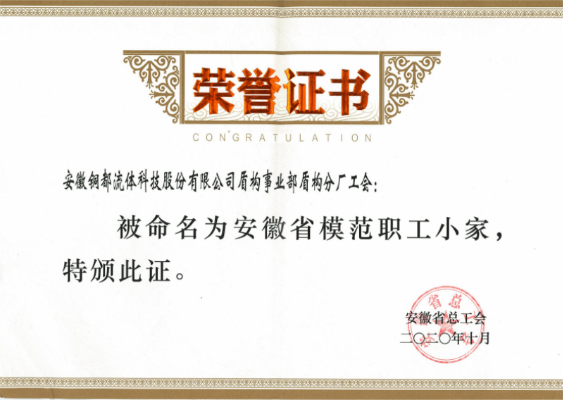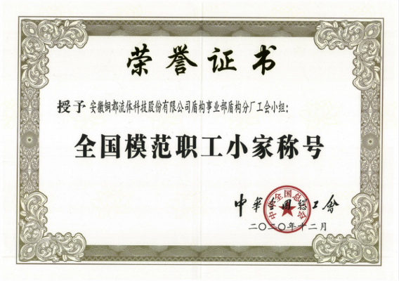 近日,安徽銅都流體科技股份有限公司盾構(gòu)事業(yè)部盾構(gòu)分廠工會(huì)小組憑借出色的工作榮獲由中華全國(guó)總工會(huì)頒發(fā)的2020年“全國(guó)模范職工小家”榮譽(yù)稱(chēng)號(hào),同時(shí)被安徽省總工會(huì)評(píng)選“安徽省模范職工小家”榮譽(yù)稱(chēng)號(hào)。